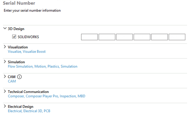 - Enter your Serial Number(s) for SOLIDWORKS and any other products. NOTE: if the 3rd digit of your SN is a “1” STOP and use the Network Installation Guide