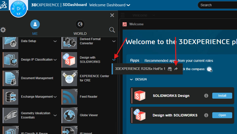 After the add-in is installed, return to your 3DEXPERIENCE Platform, and navigate to the same App menu from the Compass. Navigate to the “Design with SOLIDWORKS” app and click the dropdown arrow next to the icon.