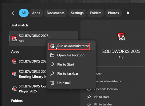 1. With SOLIDWORKS closed, launch the program by right clicking and selecting “Run as administrator”.