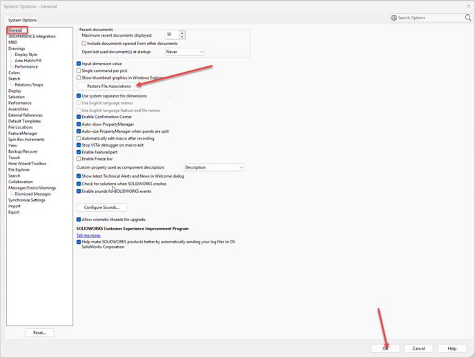2. Navigate to Tools>Options>System Options>General in SOLIDWORKS and select "Restore File Associations", then select "OK".